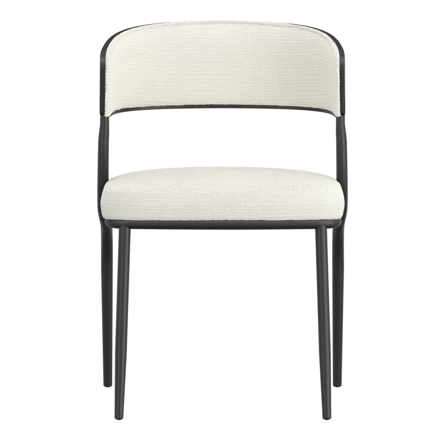This pair of contemporary dining chairs combines architectural design with practical performance. Each features a gracefully curved bentwood back paired with a black metal frame, creating a striking silhouette. The ivory textured upholstery resists water and staining, while the medium-density foam cushion ensures comfortable seating throughout meals. An ideal addition to modern dining spaces prioritizing both style and durability.
