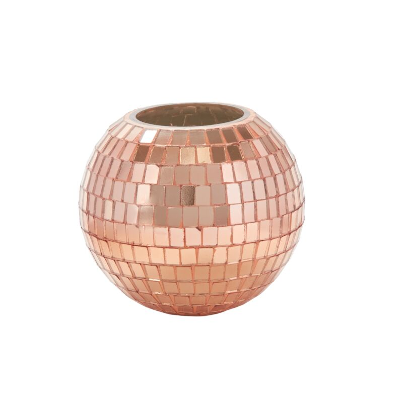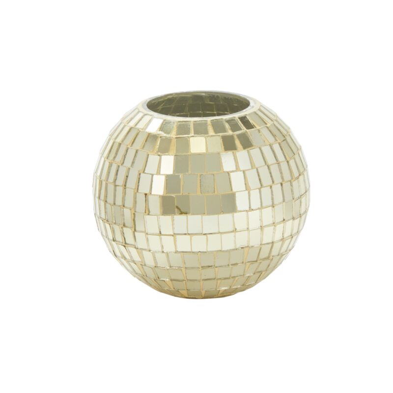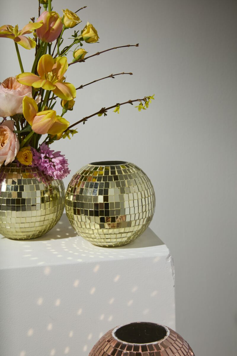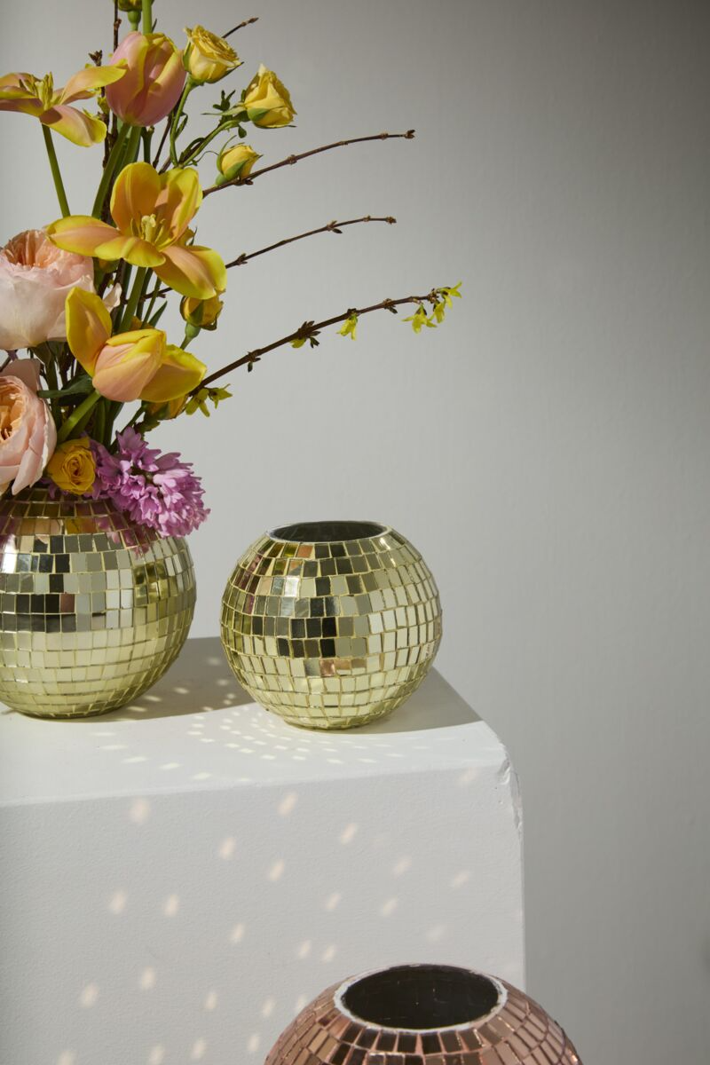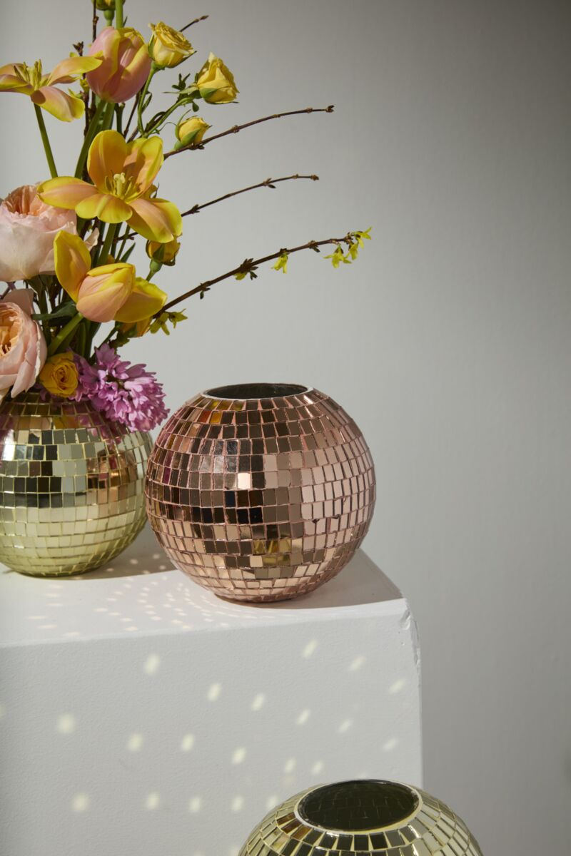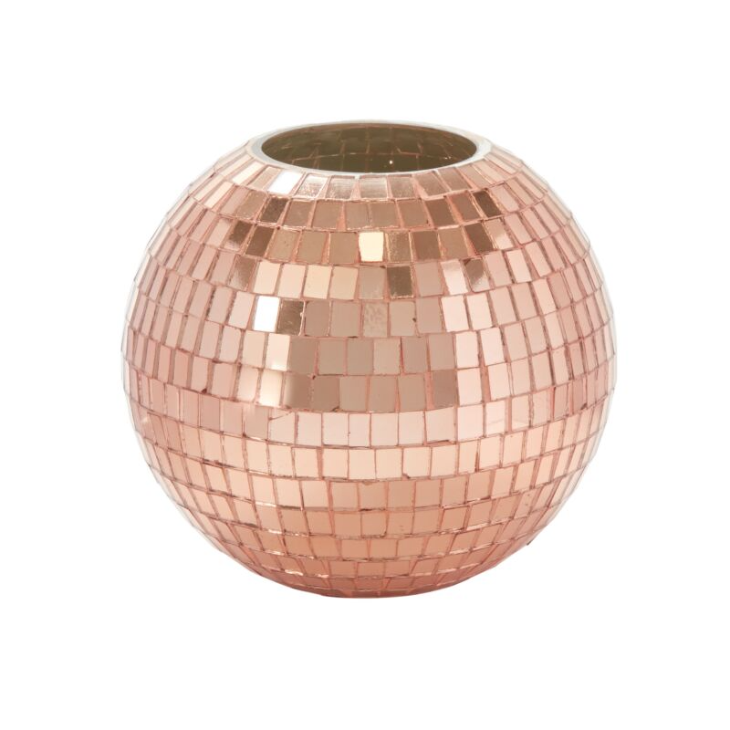 Bring sparkle and retro charm to any space with the Twila Disco Vase. Hand-applied mirrored pieces create a dazzling disco ball effect, making this vase a standout choice for floral arrangements, wedding décor, event styling, or simply adding a touch of glam to everyday settings. Its rounded glass design reflects light beautifully, ensuring your arrangements shine from every angle.