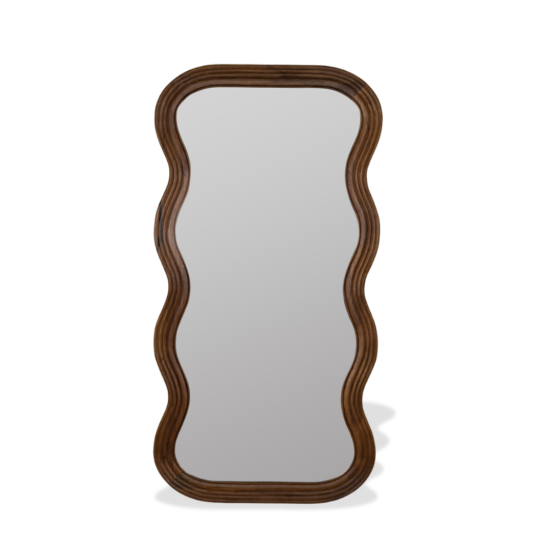 Fluid wood, sculptural reflection. The Wavy Wall and Floor Mirror is hand-carved from solid walnut, shaped into an undulating three-dimensional frame that casts captivating shadows throughout the day. Each piece shows slight variations in grain, tool marks, and natural shading—signatures of artisanal craftsmanship, not flaws. The clear glass provides a sharp, true reflection contained within its organic embrace. Lean it on the floor against a wall or hang it at eye level in a living room, bedroom, or entryway. The walnut warms minimalist or mid-century interiors without competing. Dust the wood frame with a dry cloth; clean glass with a soft cloth.